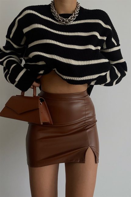 Slit Mini Leather Skirt Tan