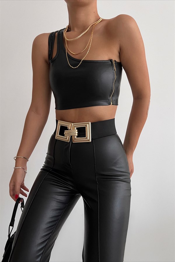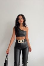 One Shoulder Leather Crop Top Black -24171