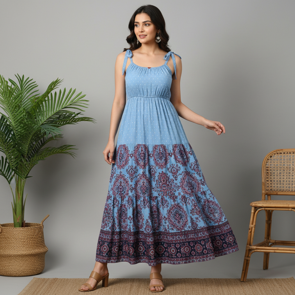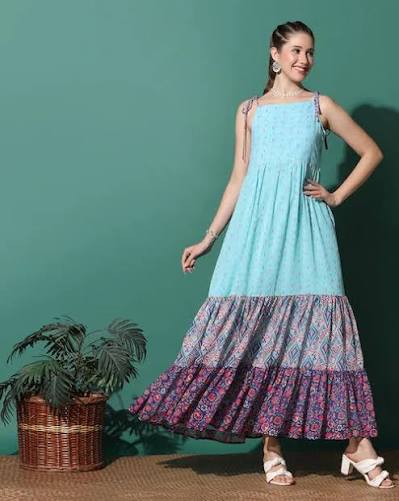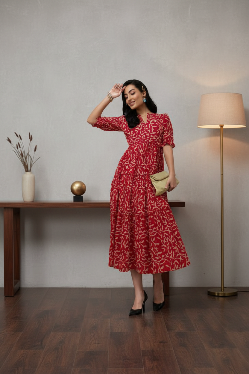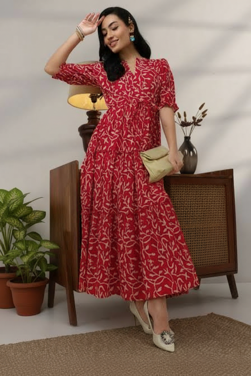 Red & Beige Printed Tiered Maxi Dress for Women