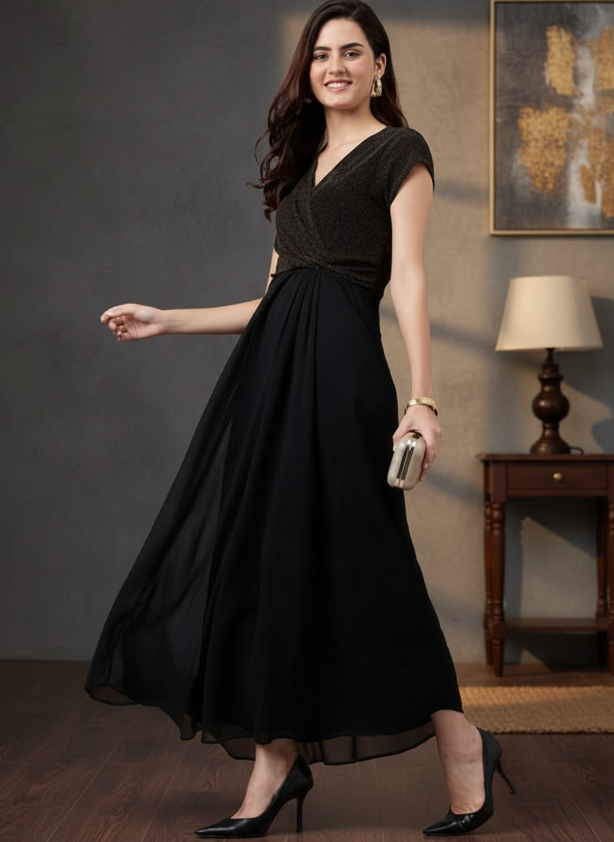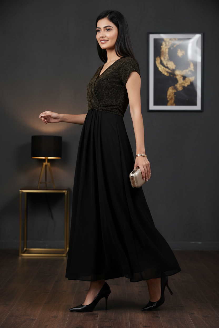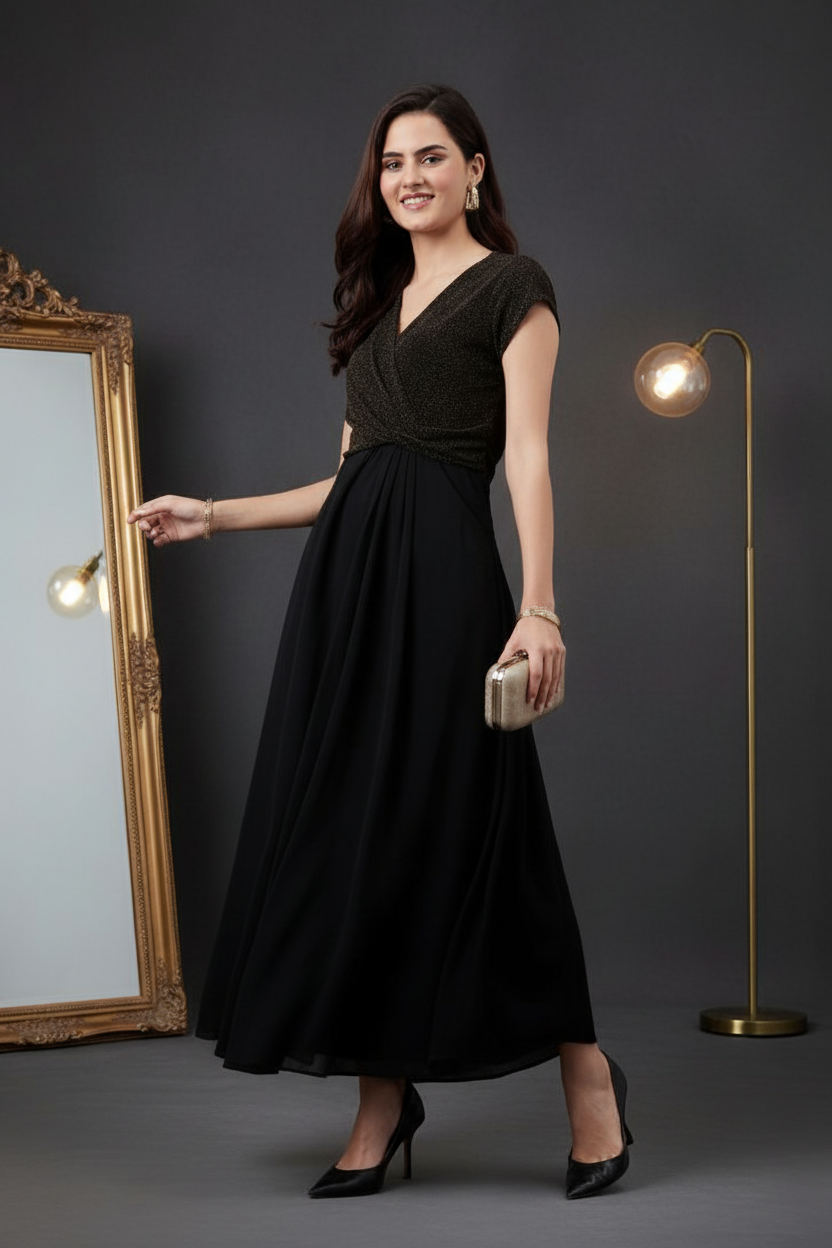 Elegant Black & Gold Shimmer Maxi Dress for Women – Party Wear