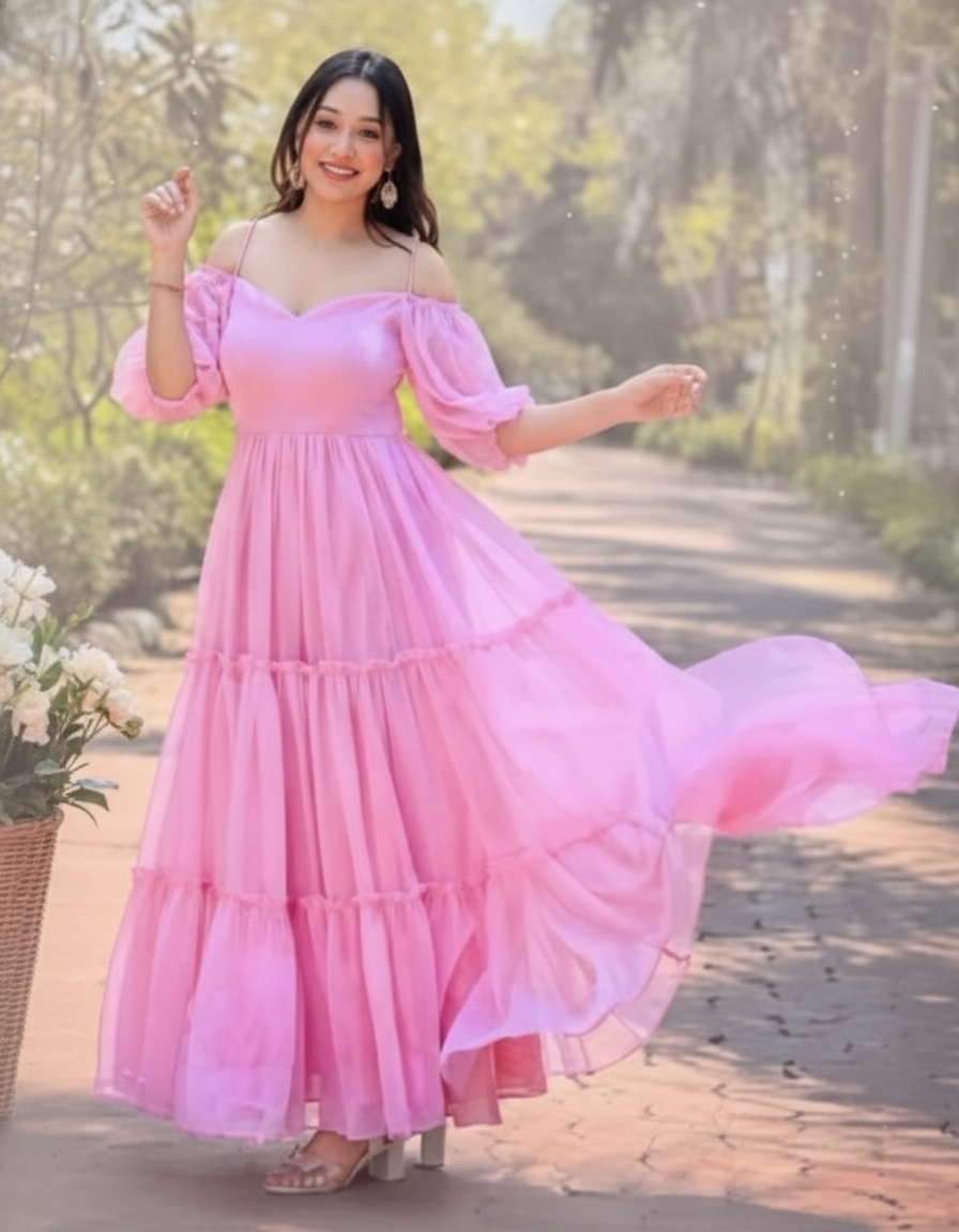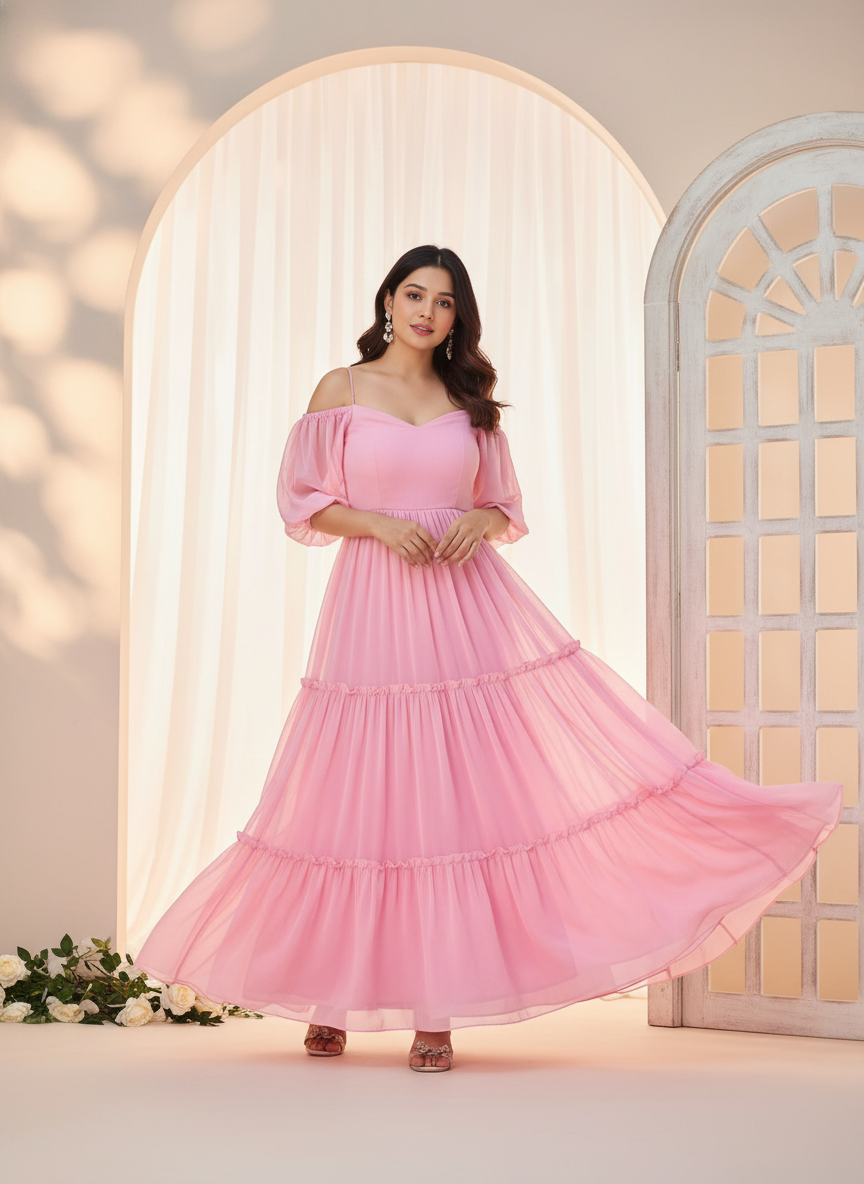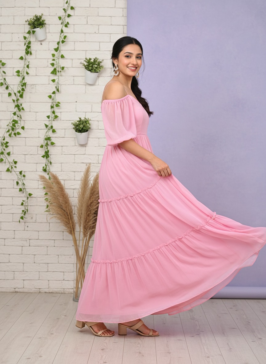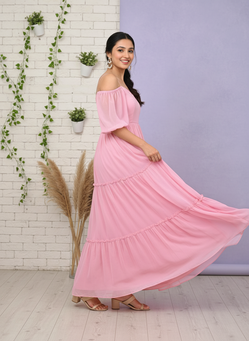 Elegant Pink Tiered Off-Shoulder Maxi Dress for Women